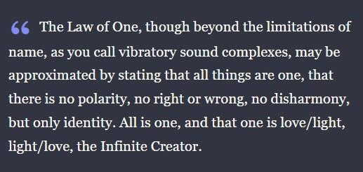 “I am Ra. The Law of One, though beyond the limitations of name, as you call vibratory sound complexes, may be approximated by stating that all things are one, that there is no polarity, no right or wrong, no disharmony, but only identity. All is one, and that one is love/light, light/love, the Infinite Creator.” (from session 4)