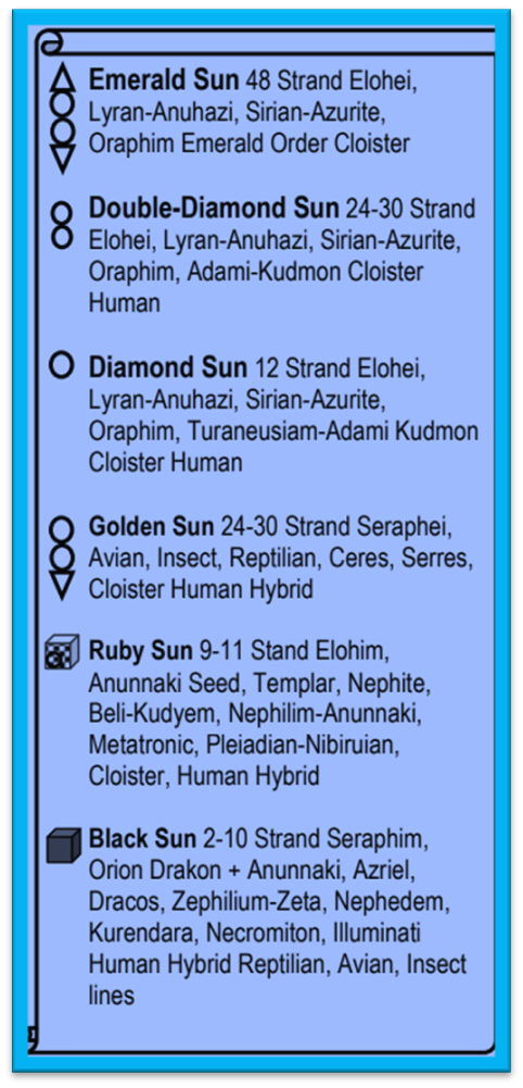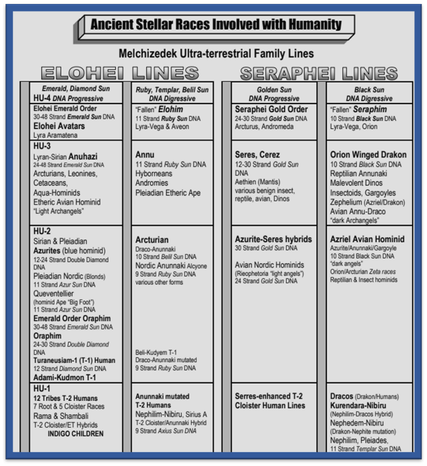 First was seeded the ANUHAZI race in Lyra. They later escaped to Sirius system. This Lyran-Sirian Race seeded the AZURITE race, the Sirian Blue Race in Sirius system. This genetic imprint was used in seeding the Turaneusiam-human on Tara with 48 DNA strands. Later on another line was created called Oraphim race with 24 DNA strands. These together formed the Oraphim Elder Race – Indigo Children are incarnates from this lineage.