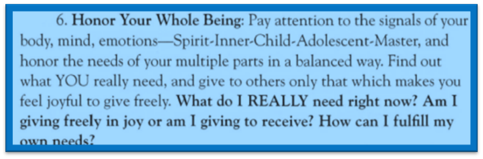 Step 6 in JOY WITH OTHERS reminds me of ATT-ONE-NESS. Treating Myself with Love, Honour, Kindness and Respect, I can meet the Other with Respect, Mutuality, Responsibility and Reverence.