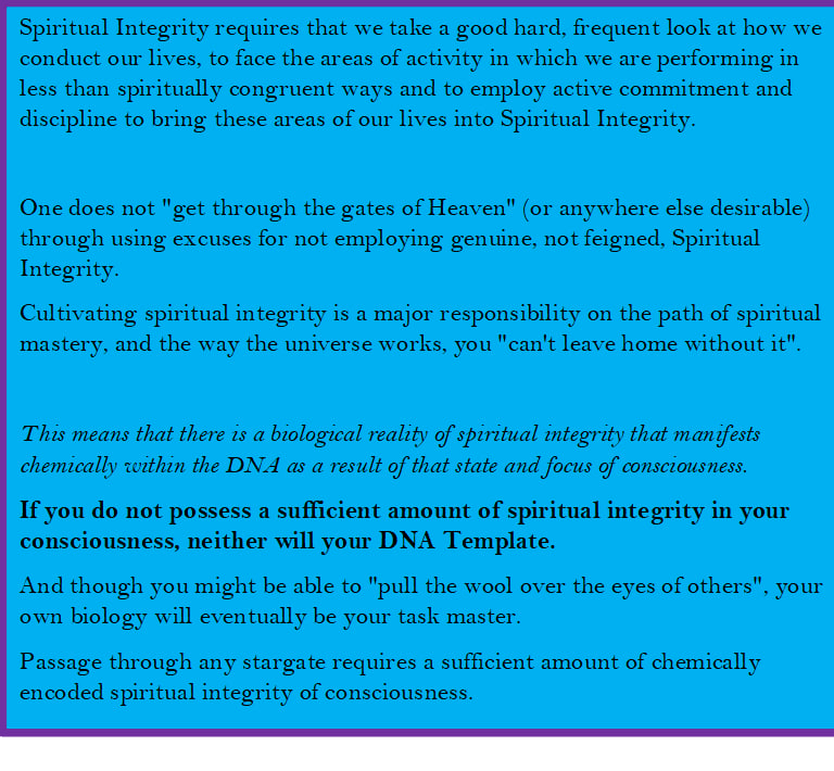 “If you do not possess a sufficient amount of spiritual Integrity in Your Consciousness, neither will Your DNA Template”. 6th Responsibility of Mastery.