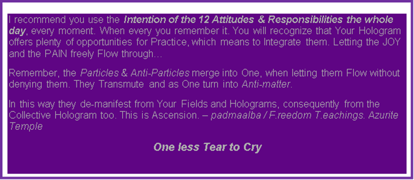 It is the Implantations, the Miasmas, we are cleansing away, when changing our ATTITUDES to contribute our own Ascension. Taking RESPONSIBILITY of our own selves, will Empower us and Increase the Speed of Our Ascension.