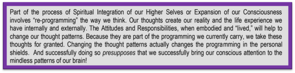 I do other Techniques in addition to meditating on the ATTITUDES & RESPONSIBILITIES. Those meditations have become more detailed experience; the colours, the movements of Frequency, the Focus, the Letting Go, The Expansion.