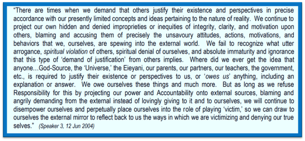 Meditation on these Attitudes & Responsibilities truly clear out the Miasmas silencing the Shadow, the Un-conscious part of me. I do the Flame Body Shadow meditation during these day, when I need it. It is empowering to KNOW, I AM IN CHARGE. And not at all a Victim subjected to Victors Games.