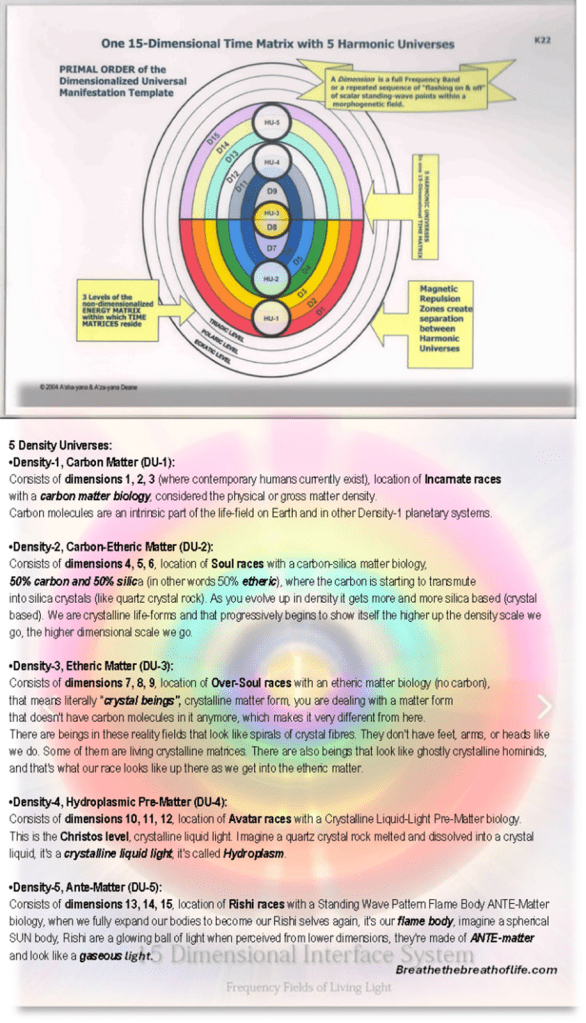 Consists of dimensions 7, 8, 9, location of Over-Soul races with an etheric matter biology (no carbon),that means literally “crystal beings”, crystalline matter form, you are dealing with a matter form that doesn’t have carbon molecules in it anymore, which makes it very different from here.